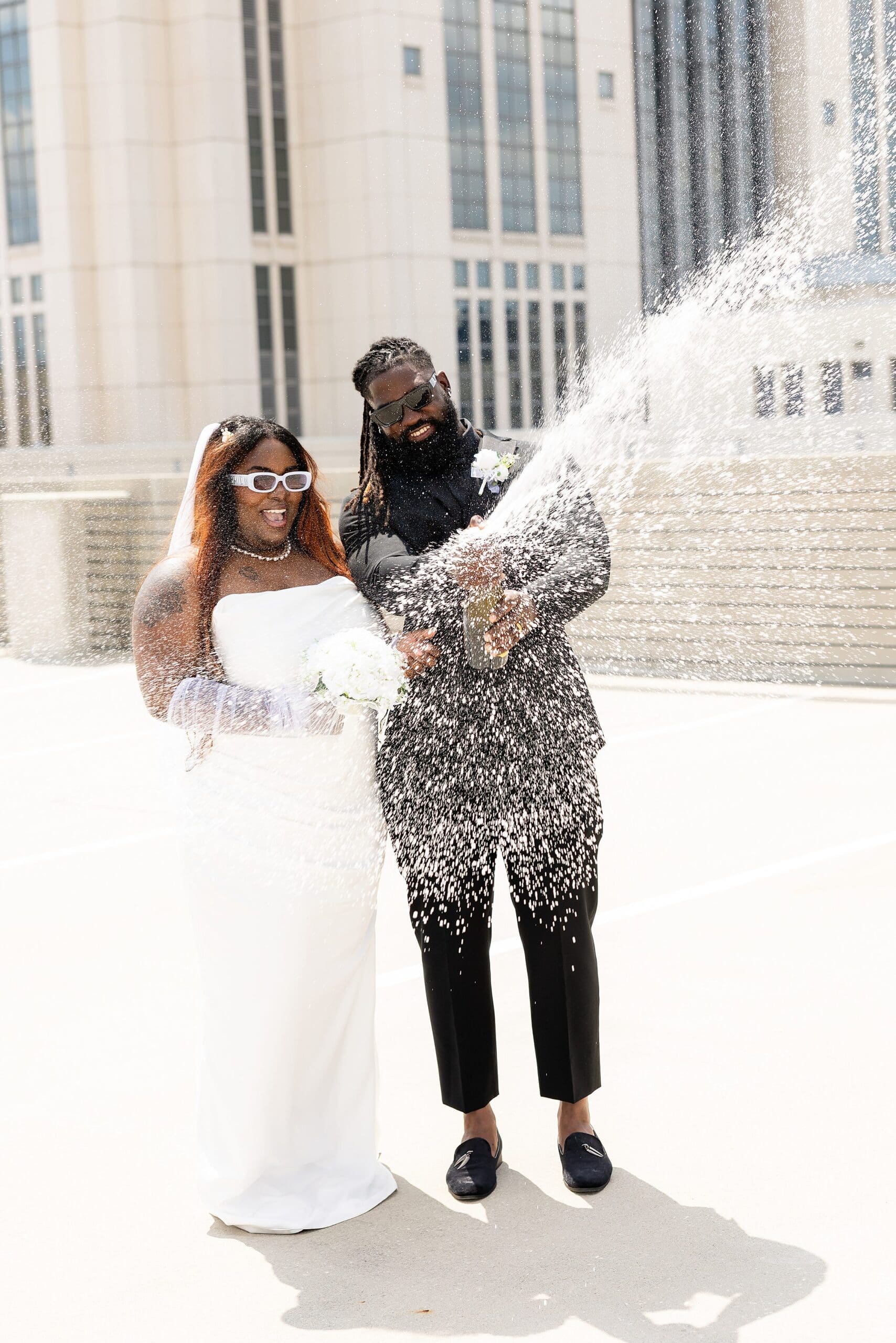 After family photos, we did their private session on the courthouse steps, in the marble hallways, and on the rooftop with a champagne spray.